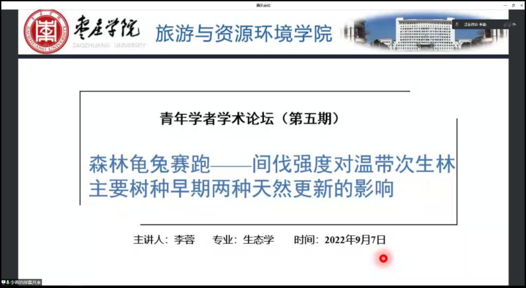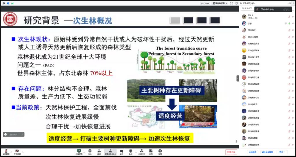 报告会上,李蓉博士做了题为“森林龟兔赛跑——间伐强度对温带次生林主要树种早期天然更新的影响”的精彩报告,介绍了不同强度间伐后次生林早期两种天然更新过程,并比较了不同更新起源幼苗的生长、形态、生理特征。研究发现:间伐虽然降低了种子雨和土壤种子库密度,但有利于提高实生幼苗存活率;间伐触发了伐桩萌蘖,高强度间伐有利于萌蘖苗存活;间伐后种子更新是间伐后次生林的主要天然更新方式,两种更新方式相对重要性变化则是由两种更新幼苗的能量来源(母树伐桩和根系)和资源分配方式的不同导致的。该研究通过对比不同更新方式的幼苗密度,首次确定了次生林间伐后早期阶段中主要树种的三类天然更新偏好,并丰富了萌蘖更新影响机制研究。在报告问答互动环节,与会师生与报告人就感兴趣的内容与热点问题进行了讨论和交流。