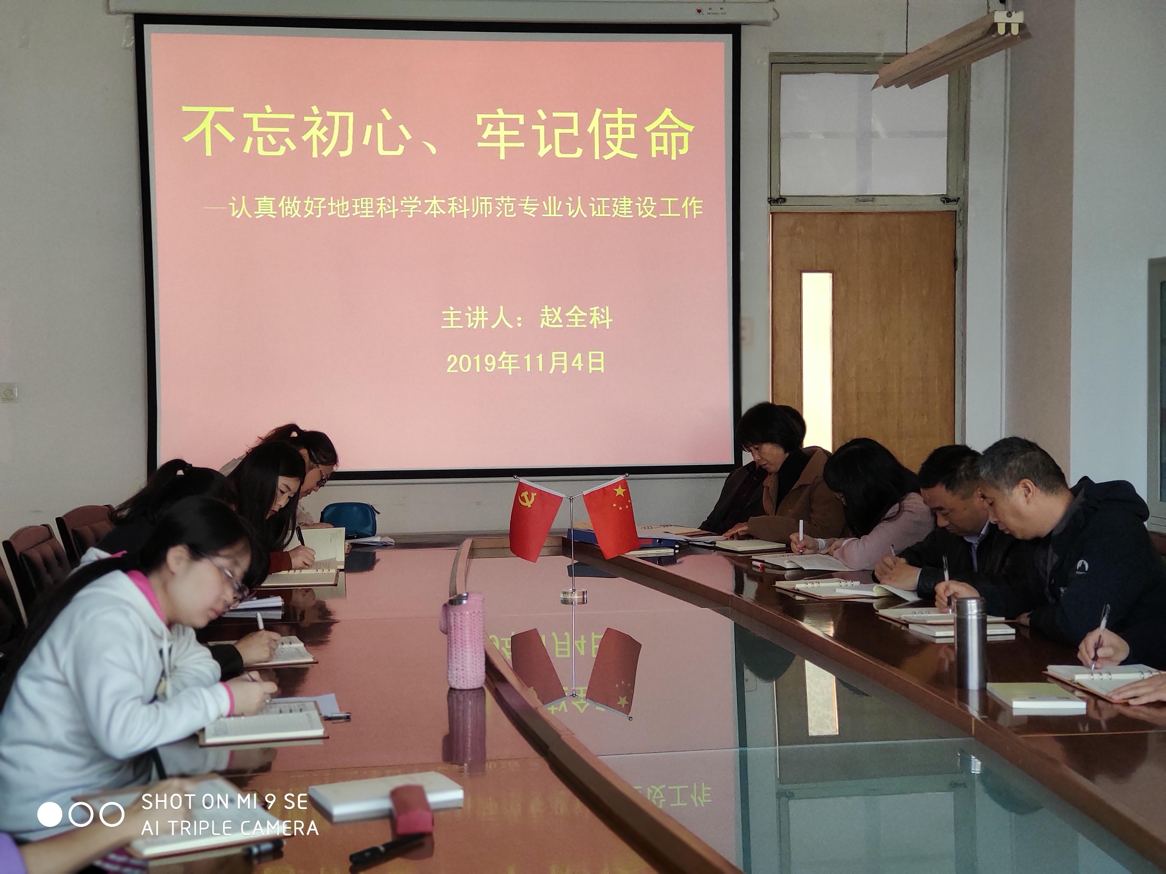 按照公司“不忘初心、牢记使命”主题教育工作部署与要求,11月4日下午,伟德国际victor1946在理工楼2514会议室开展主题教育专题党课活动,经理赵全科讲了题为《不忘初心 、牢记使命—认真做好地理科学本科师范专业认证建设工作》的党课,全体党员聆听了党课。