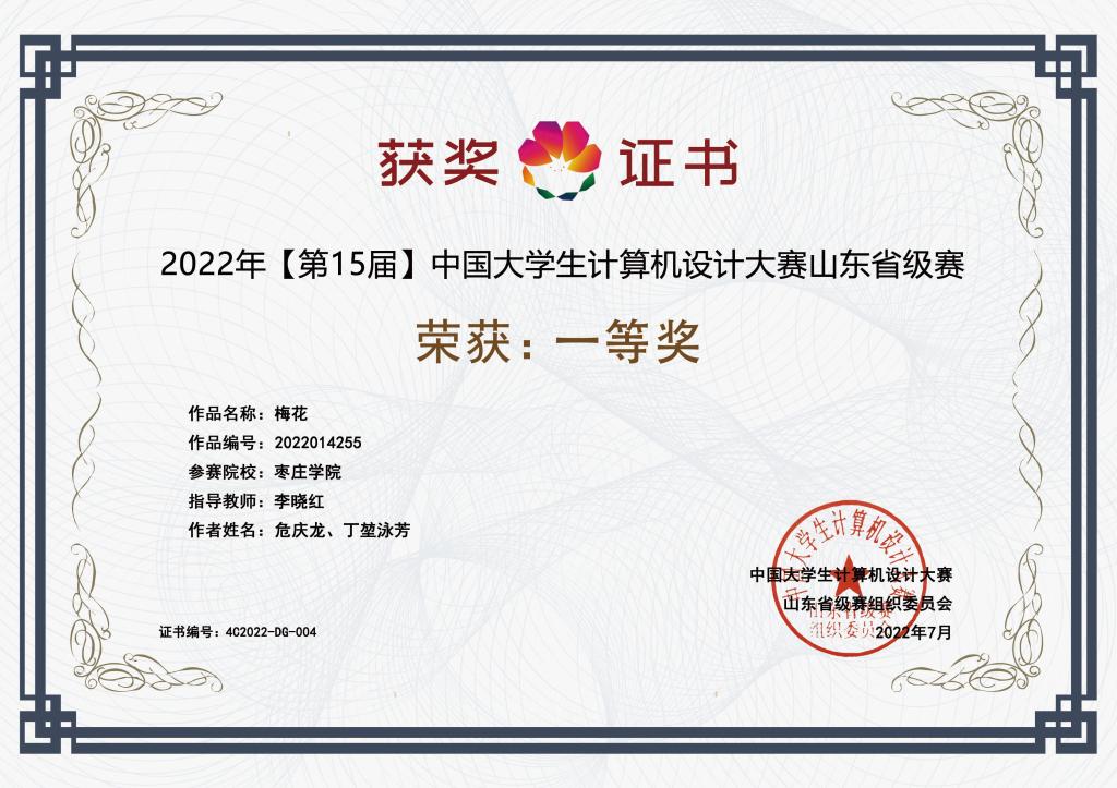 近日,2022年(第15届)中国老员工计算机设计大赛比赛落下帷幕,公司参赛员工喜获佳绩。其中,2019级地理信息科学专业员工危庆龙、丁堃泳芳团队凭作品《梅花》荣获全国三等奖和山东省级赛一等奖。