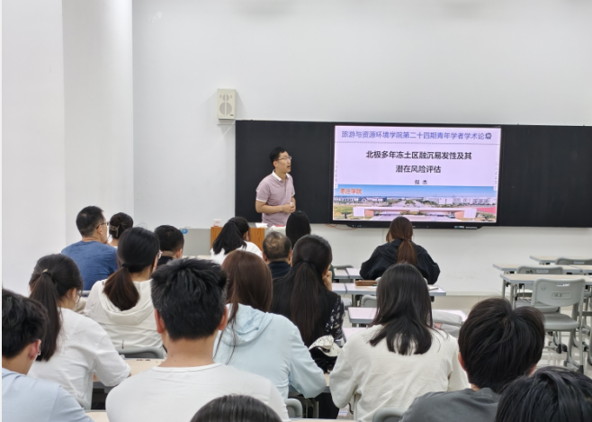 在报告会议上,倪杰博士就“北极多年冻土区融沉易发性及其潜在风险评估”进行了学术报告。倪杰博士研究发现环北极多年冻土区融沉风险的关键因子是以触发因子为主,即NDVI和冻结指数,孕育因子中地下冰含量也具有较高的解释度;热融沉降易发性评估结果得出,融沉风险空间格局表现为整体分散,局部集中的特征,靠近北极点的冻土融沉风险相对稳定,中等风险多位于最南端;当前,环北极地区有256.21万人以及2亿多平米房的建筑物处在不同融沉风险威胁之下,而这些人口和建筑物的空间分布特征表现为,处在高融沉风险等级下的占比较高,约40%以上,而低风险区的占比较少,仅20%左右。