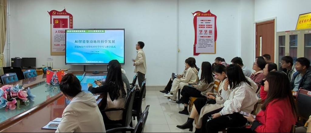 陈晓萍以“课程知识图谱创建”为主题,结合实际课程案例和自身经验,从知识图谱建设、应用(资源关联、学情统计、问题图谱等)等方面,细致全面得分享了课程知识图谱创建的过程与注意事项。董志鹏以“AI智能驱动地科科学发展”为主题,结合《The Innovation》最新发表的综述“Artificial intelligence for geoscience: Progress, challenges, and perspectives”,探讨AI在地球科学中的最新进展、在不同圈层的具体应用情况、面临的挑战以及未来的发展方向,并分享了应用常见国内AI模型进行《旅游地理学》备课的经验。