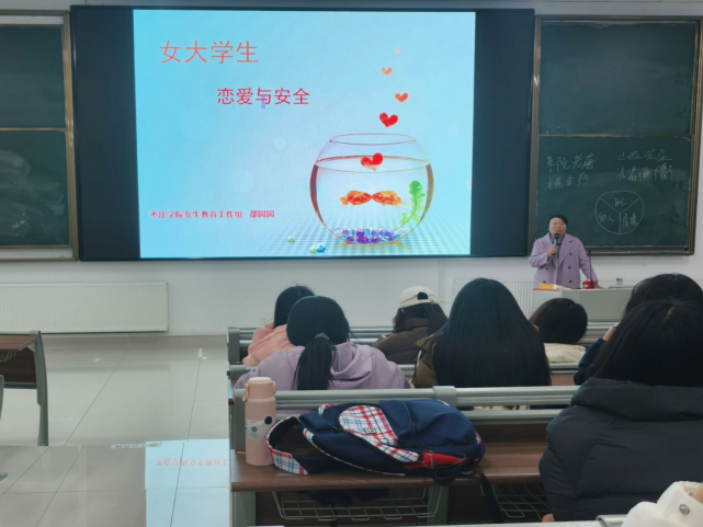 邵园园从“爱情到底是什么”“爱情需要什么”和“怎样去达到一个较好的爱情状态”三个问题展开论述,诠释爱情的真谛,帮助同学们提升爱与被爱的能力。随后,邵园园结合具体实例,聚焦当下女老员工在恋爱过程中常遭遇的心理挑战和安全问题,引导同学们正确认识自身情感需求,学会理性处理恋爱矛盾,并强调在恋爱观上应注重道德修养和精神追求,确保恋爱关系的纯洁、稳定与高尚。同时,邵园园围绕出行、住宿、兼职等多个方面指出并分析女生在安全防范中存在的不足以及应对方法,有助于加强同学们的安全防范意识、提高其风险应变能力。最后,邵园园指出“爱情不是生活的全部,爱自己才是终身浪漫的开始”,希望同学们在大学期间正确处理好恋爱、学习与生活的关系,塑造更好的自己。