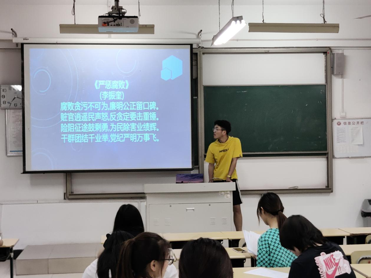 赛前,纪检部副部长付傲伟宣读比赛规则,根据幻灯片所投廉政诗词进行书写,要求书写工整,字迹清晰。比赛开始,同学们个个坐姿端正,纷纷提笔在纸上用心的书写一个个汉字,一笔一画书写工整行楷,一撇一捺彰显自我风采,力求向大家展示出自己最好的书写水平。