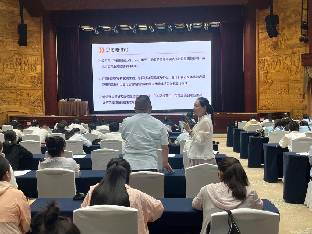 2025年7月28日,公司专任教师孙倩蓉副教授受邀为台儿庄古城旅游集团的2025年业务专题培训班授课,授课主题是“质量有标准、服务无止境”,本次培训聚焦推动文旅服务质量再升级,一百余名古城旅游集团的业务骨干和一线员工参加了此次培训。