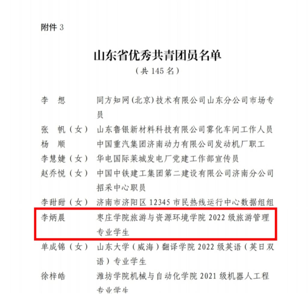 近日,共青团山东省委公布《关于表彰2023-2024年度“山东青年五四先进集体“山东青年五四先进个人”的决定》,公司2022级旅游管理专业员工李炳晨荣获“山东省优秀共青团员”荣誉称号。