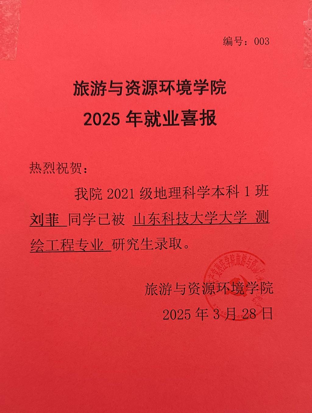 喜报!21地理科学本科1班刘菲被山东科技大学录取!