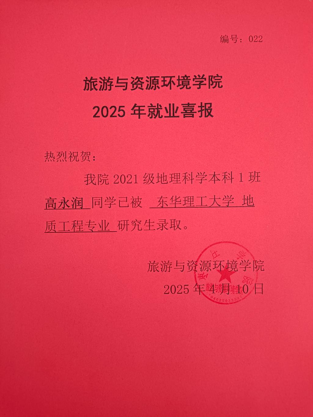 喜报!21地理科学本科1班高永润被东华理工大学录取!